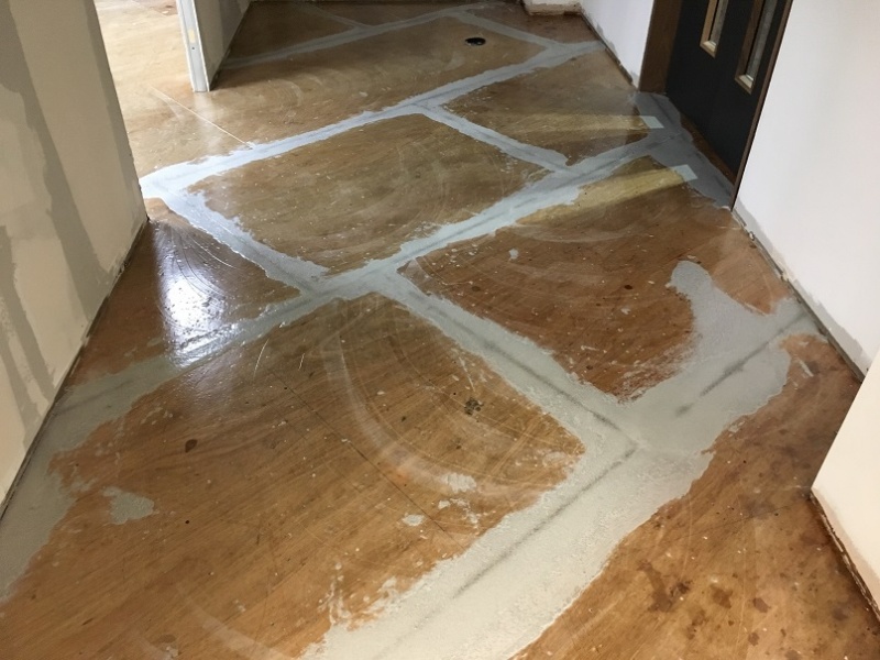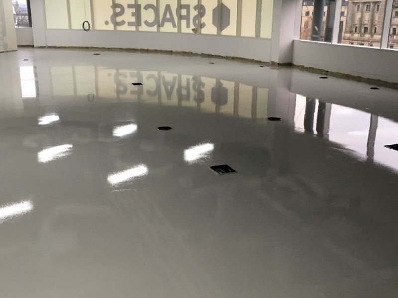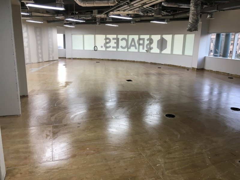 Plywood was installed onto the raised access floor and was then skimmed at all joining edges. Following curing of the skim coat the floor was then primed with the self smoothing product being installed the following day. To complete the installation two coats of matt sealer were applied to the floor to protect the finished floor and dampen the reflection of the floor.