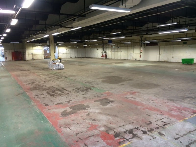 The whole area was closed off for the works allowing full access to carry out the works as one project. The floor was shot-blasted with some areas requiring industrial grinding to remove laitance left over from removed floor tiles etc. Following the floor preparation the floor was coated with two coats of high build epoxy resin silver grey providing a bright finished floor.
